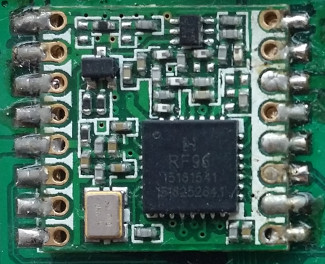 RFM95W module, shown mounted on a custom PCB